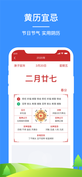2、内置的历法系统整合了紫金山天文台历算数据,可提供包含黄历宜忌、五行八字、节气物候在内的传统历法信息服务。